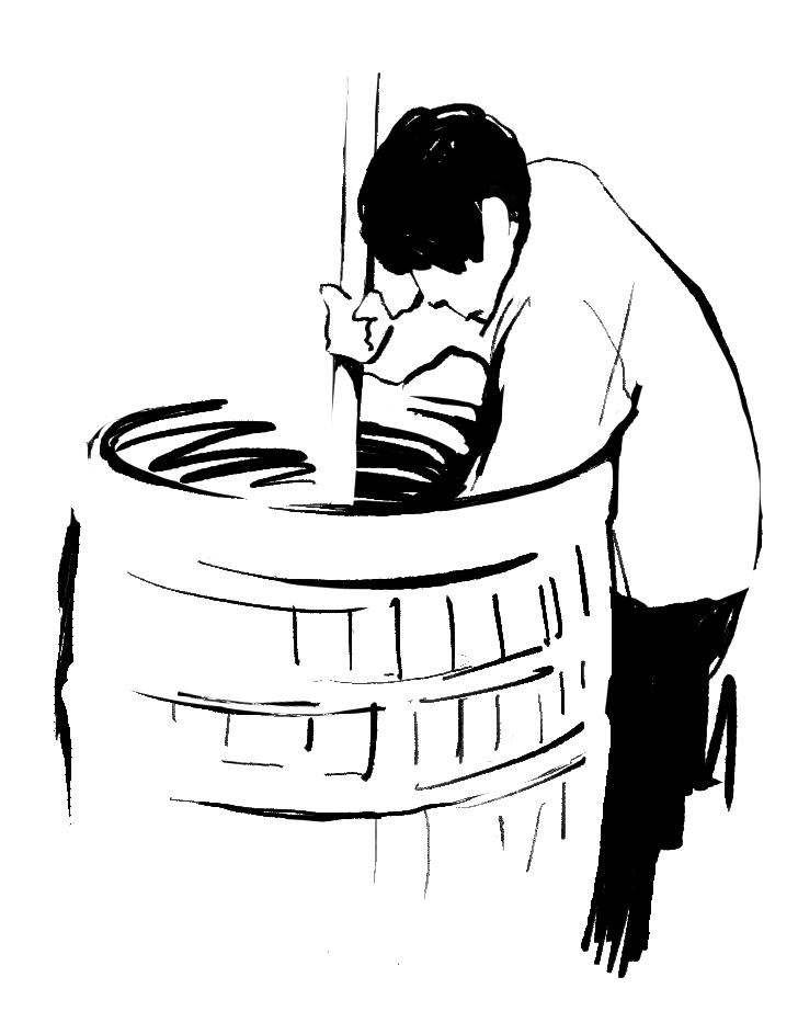 収穫してから24時間以内は櫂棒(かいぼう)でかき混ぜる醸(かも)し作業を行います